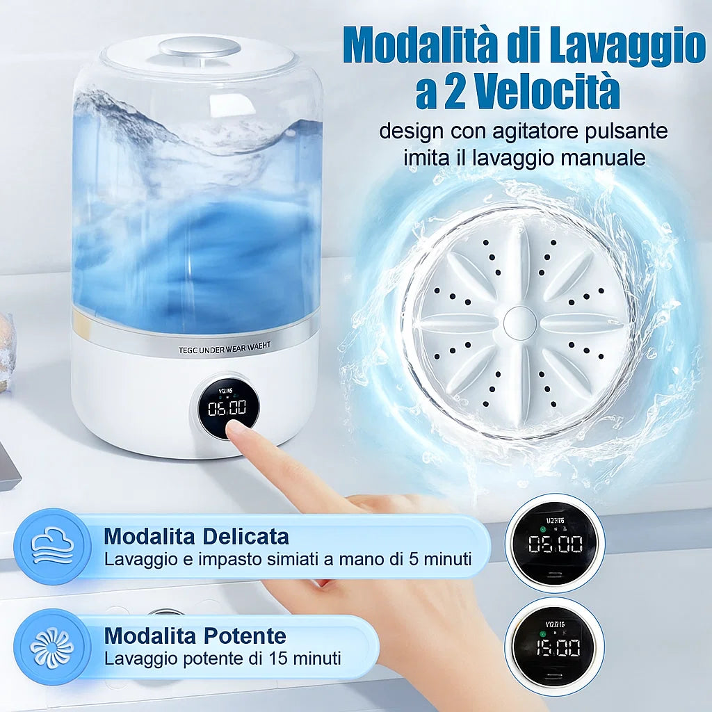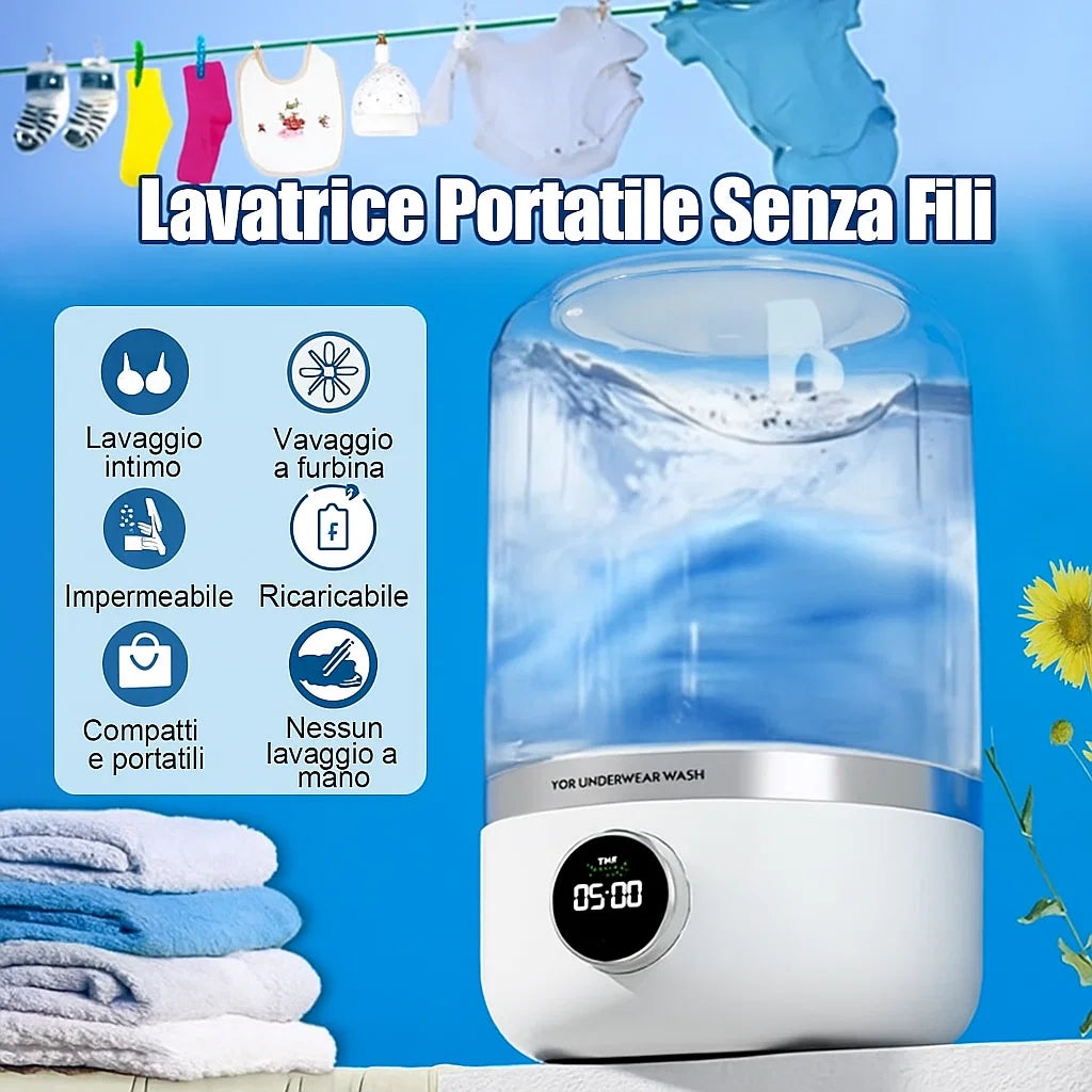 Lavare a mano i capi delicati trasforma il tuo prezioso tempo libero in noiose sessioni di bucato. Questa mini lavatrice wireless trasforma il noioso lavaggio manuale in una comoda operazione senza sforzo. Liberati dalla seccatura e mantieni perfettamente puliti i tuoi indumenti intimi ovunque tu vada.